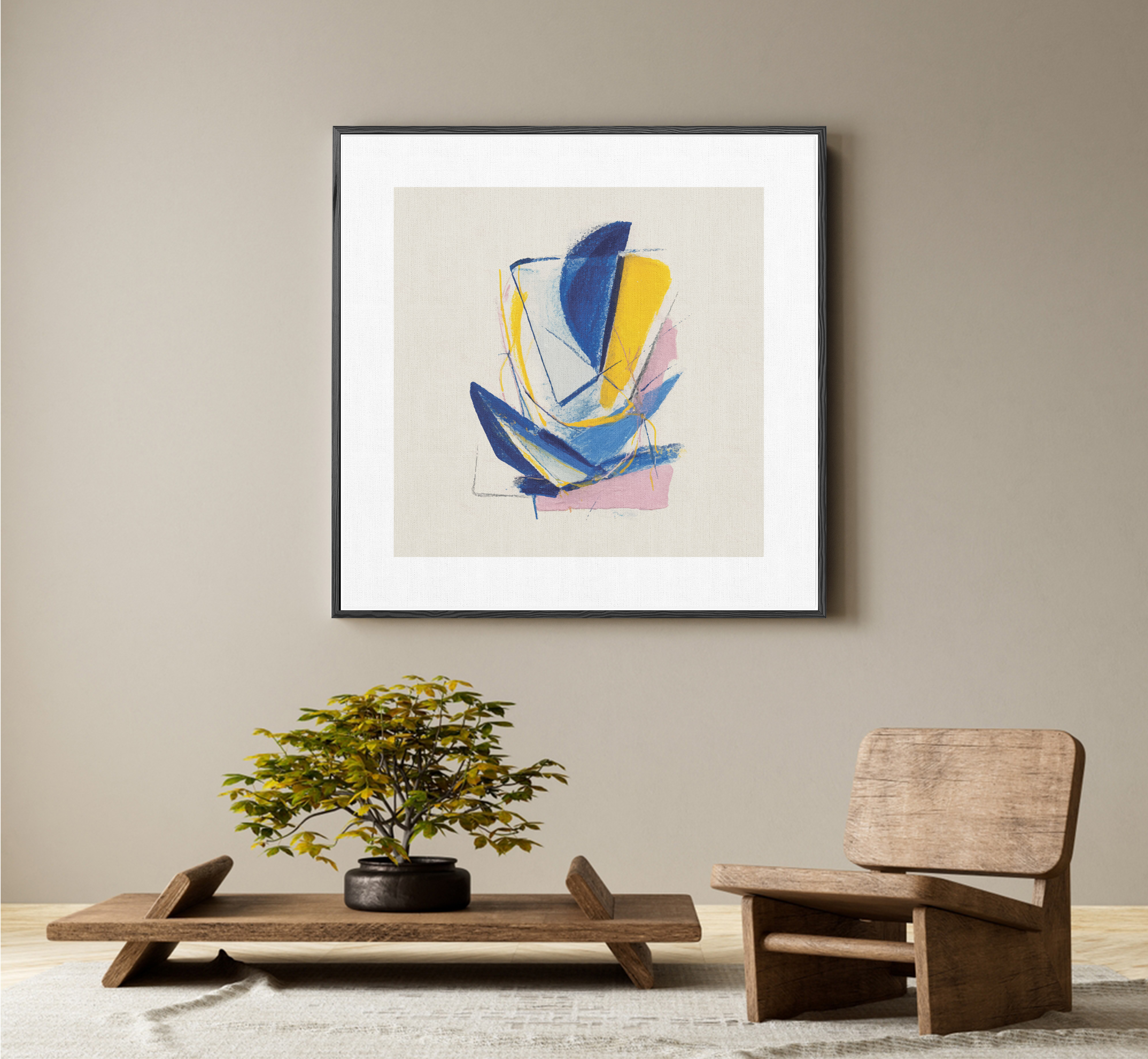 Dynamic strokes of cobalt blue, radiant yellow, and soft pink converge in sharp yet fluid motion. The piece balances strength with delicacy, embodying the rhythm of modern abstraction and the elegance of controlled chaos.