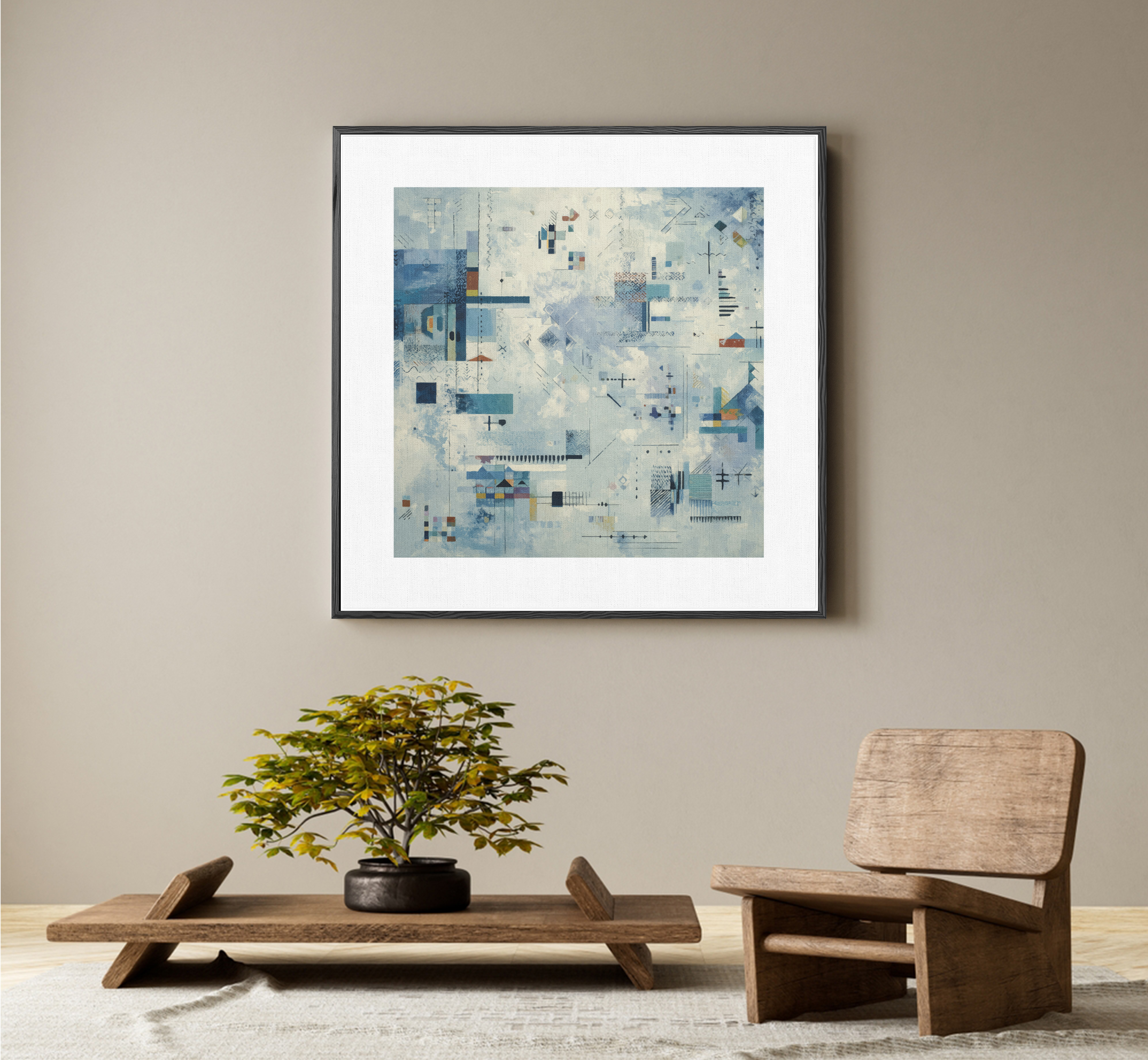 An intricate composition of geometry and imagination — this artwork unfolds like an architect’s sketch of the unseen, blending order and chaos into a poetic visual rhythm. Shades of blue wash over the canvas, guiding the eye through symbols, lines, and hidden stories.
