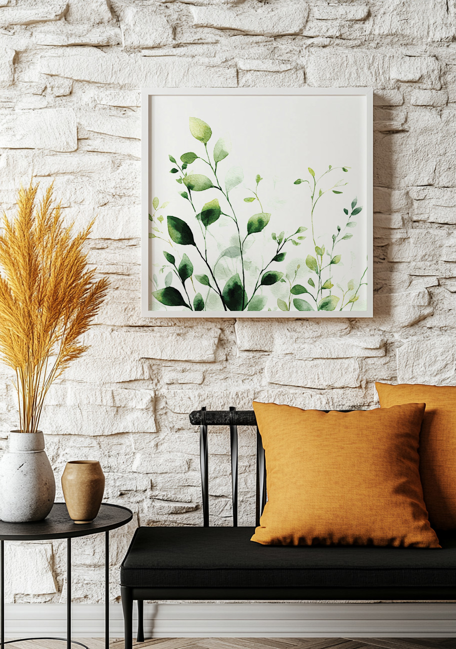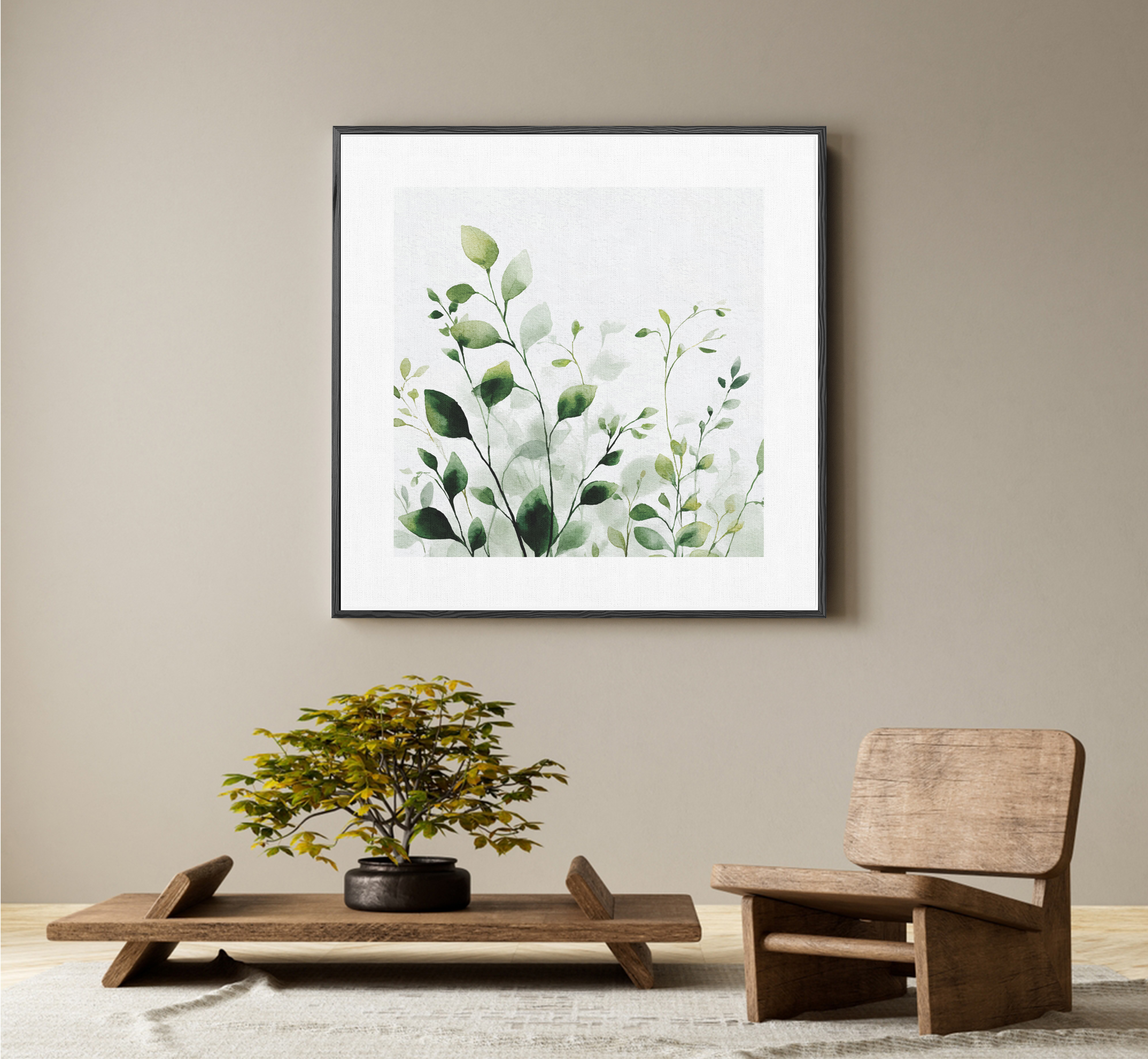 Soft watercolor leaves rise gracefully, their delicate shades of green blending into gentle shadows. This artwork captures the purity of nature’s stillness, a minimal yet soulful piece that brings freshness and calm to any space.