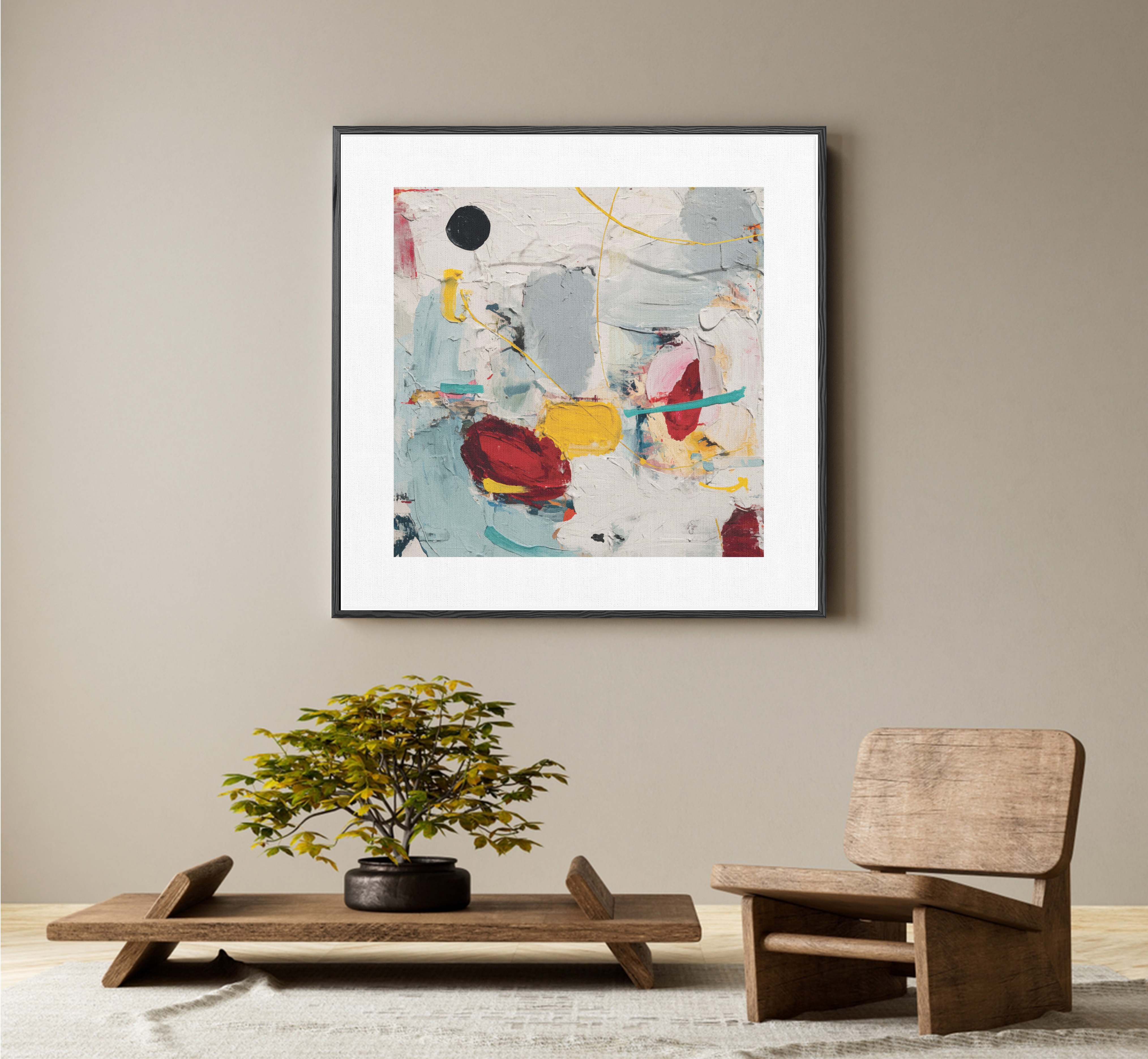 A bold interplay of crimson, yellow, and teal strokes over textured whites and greys. This abstract piece radiates raw energy and fearless expression