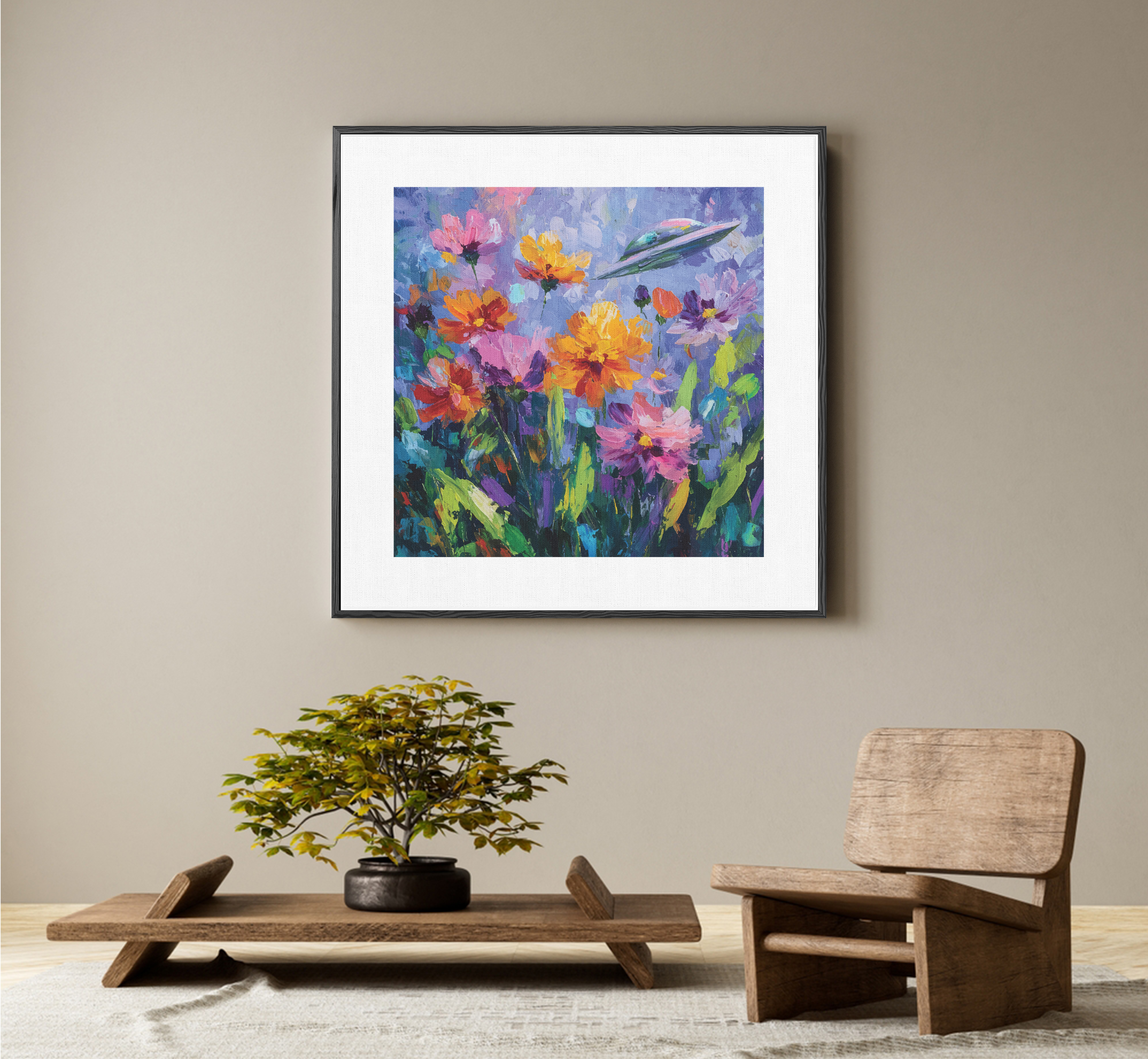 Bold florals bloom in radiant color as a UFO drifts above — a surreal meeting of earth and cosmos