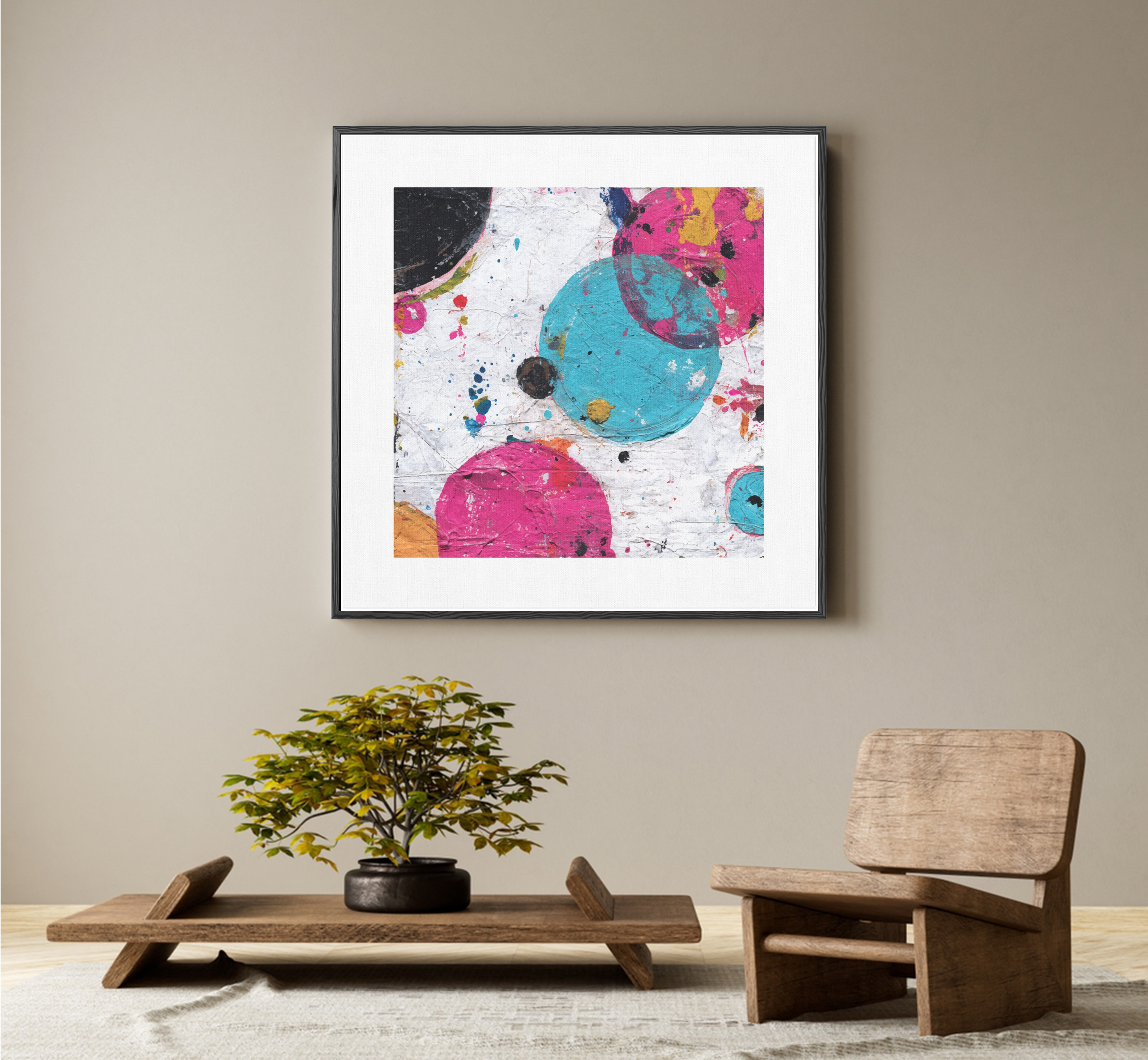Bold circles of color collide in playful chaos, bringing cosmic energy to the canvas.