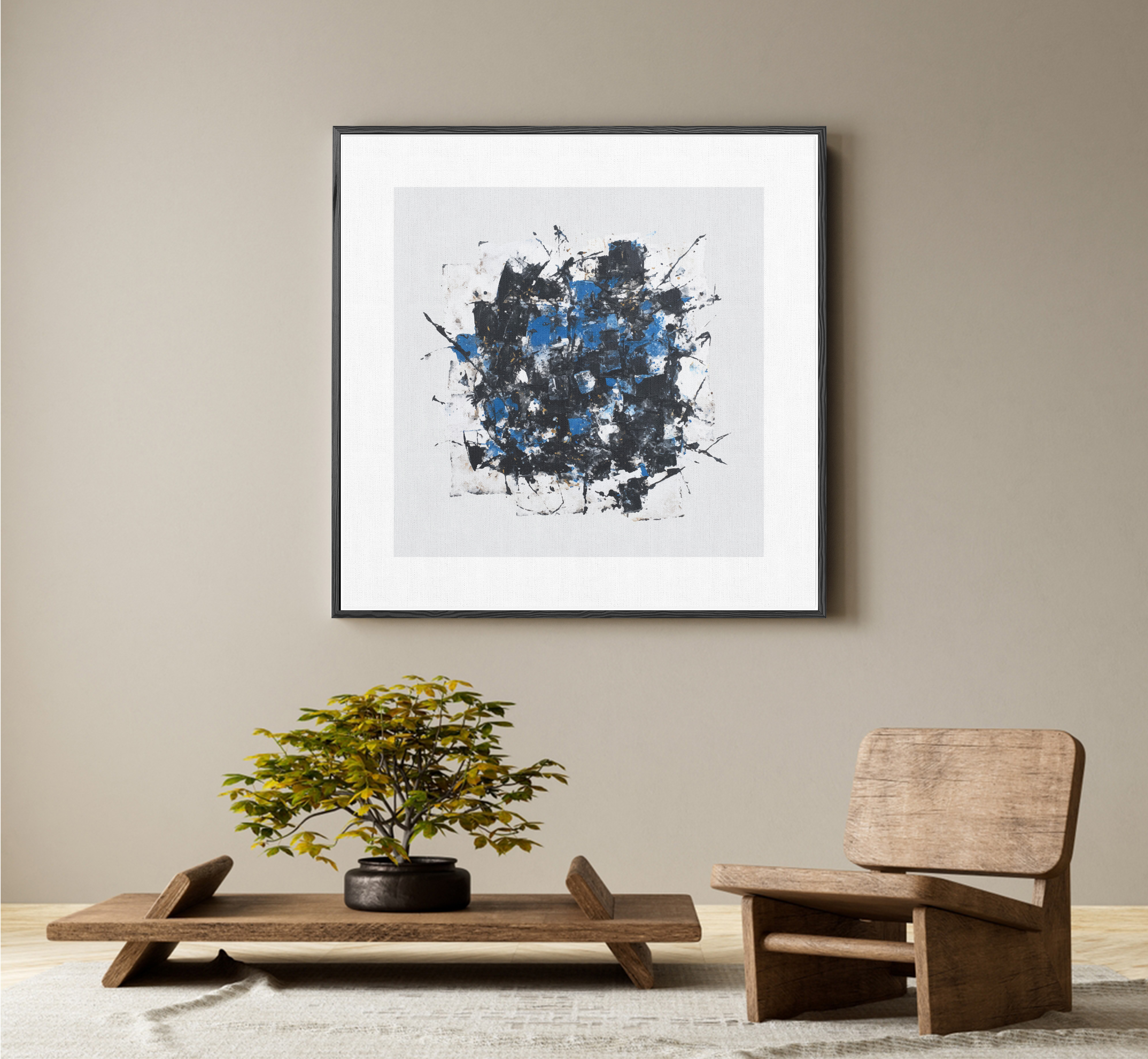 An explosion of layered strokes in deep black and vivid blue unfolds like controlled chaos. The fragmented textures and raw energy evoke emotion, rhythm, and an untamed freedom of expression.