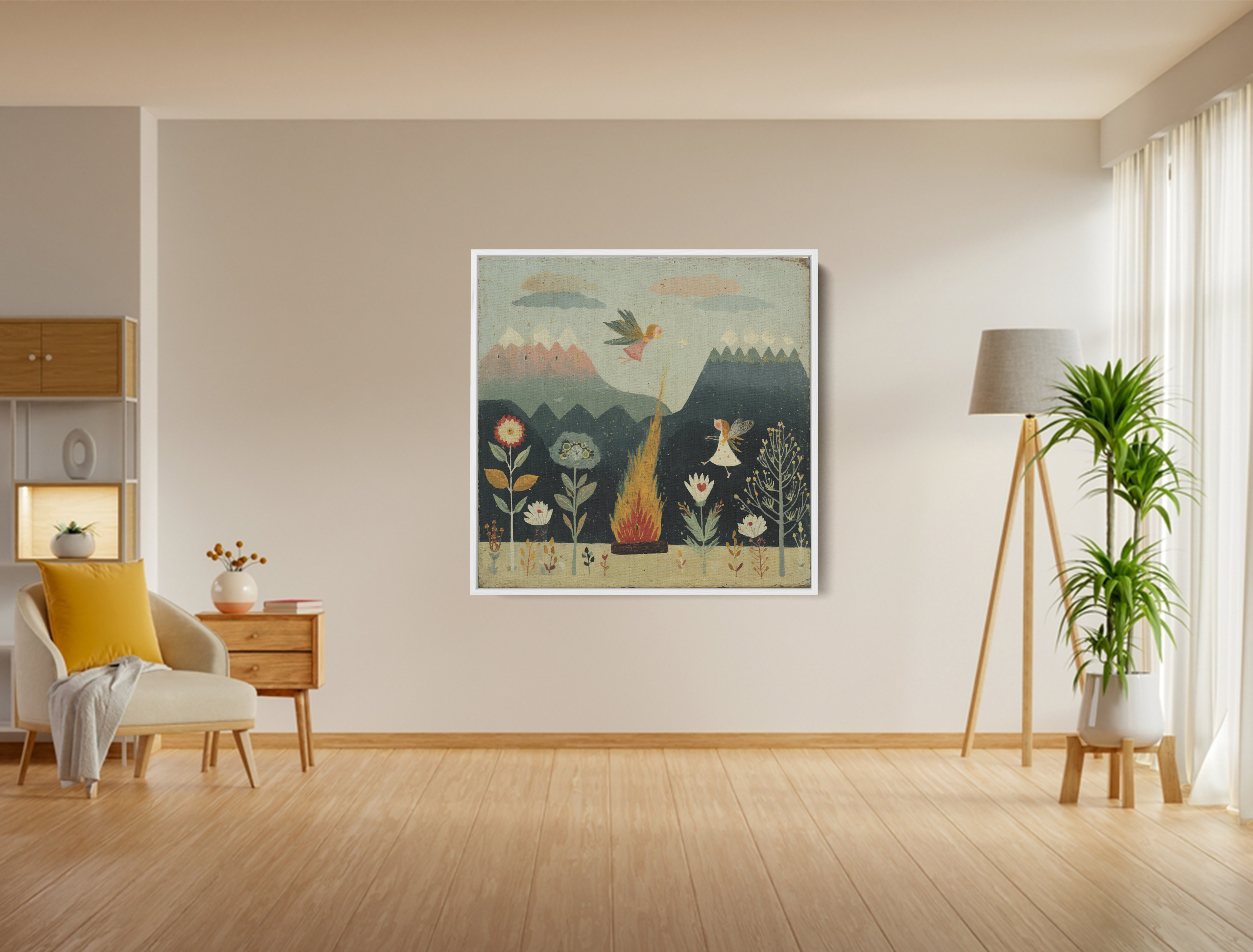 Winged figures dance around a glowing fire, framed by blooming flowers and distant mountains in a dreamlike folk style.