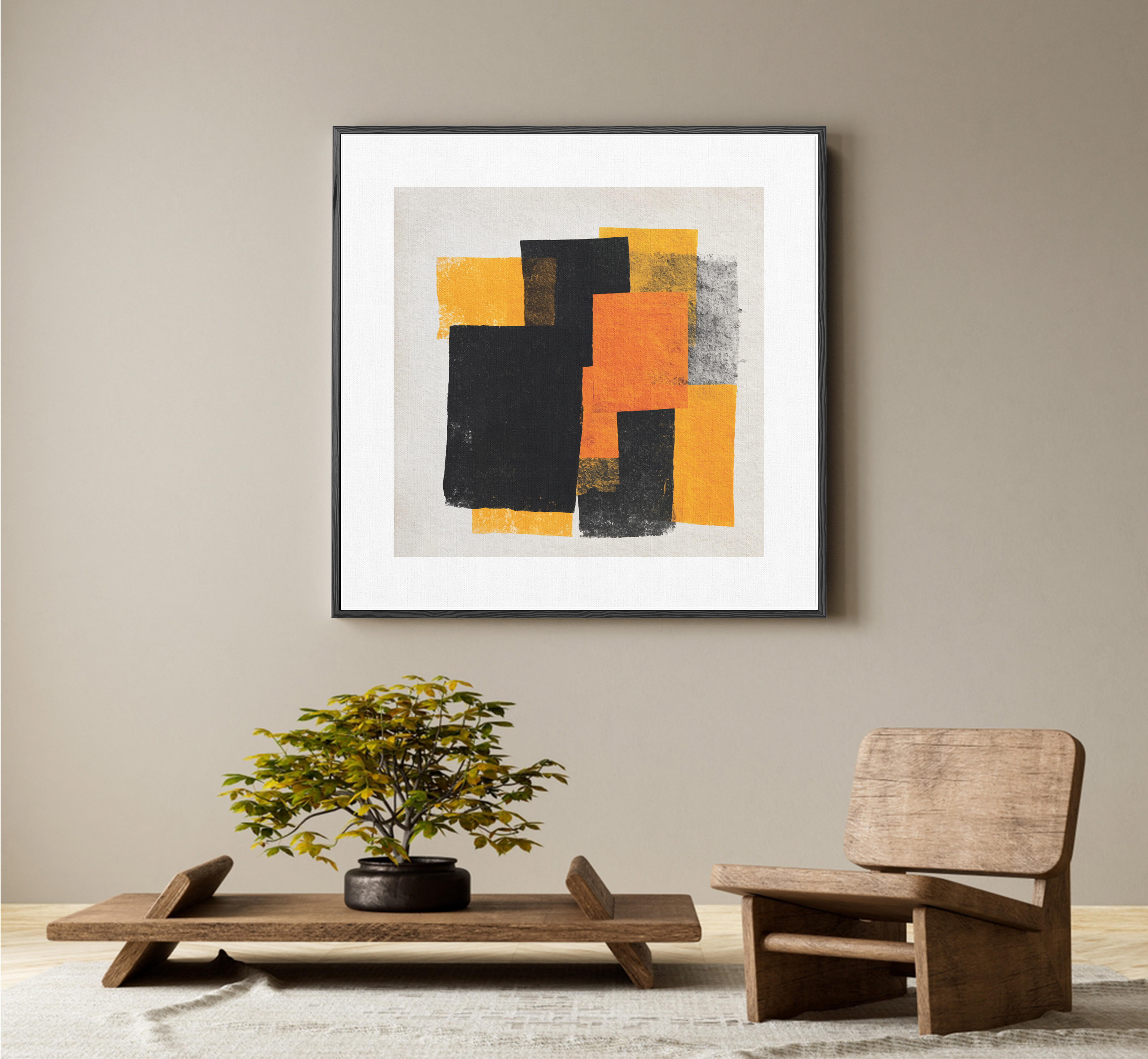 Rectangles collide in fiery orange, golden yellow, and deep black—each block carrying a story of contrast, rhythm, and bold elegance. A composition that feels both raw and refined, like a modern heartbeat painted in color.