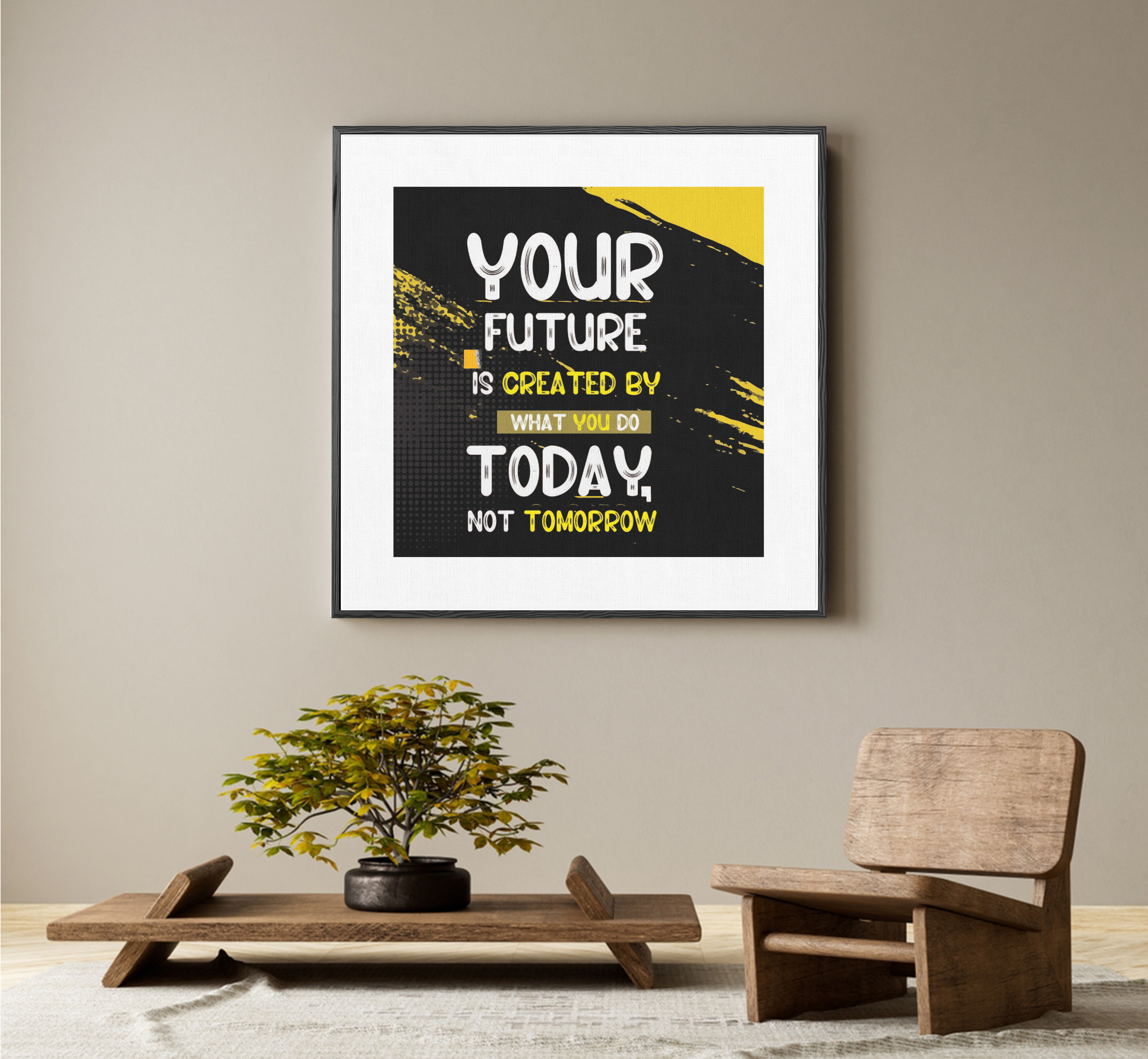 A bold motivational typography artwork reminding us that tomorrow is shaped by the choices we make today. Designed with vibrant contrasts of yellow, white, and black, it energizes the viewer to act now instead of waiting.