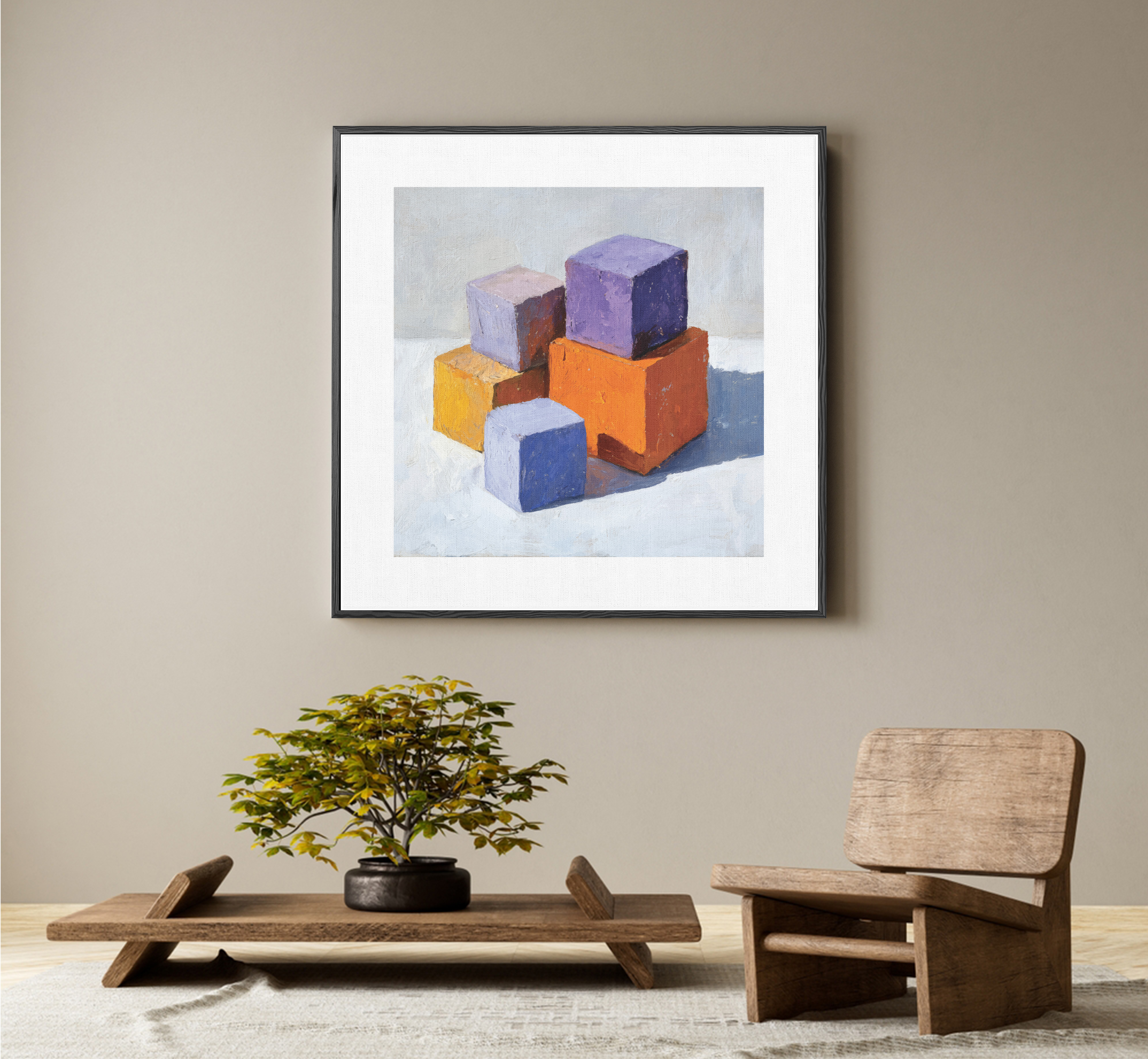 Stacked cubes in radiant orange, violet, and soft lavender create a striking balance of form, texture, and light — a bold interplay of geometry and modern expression.