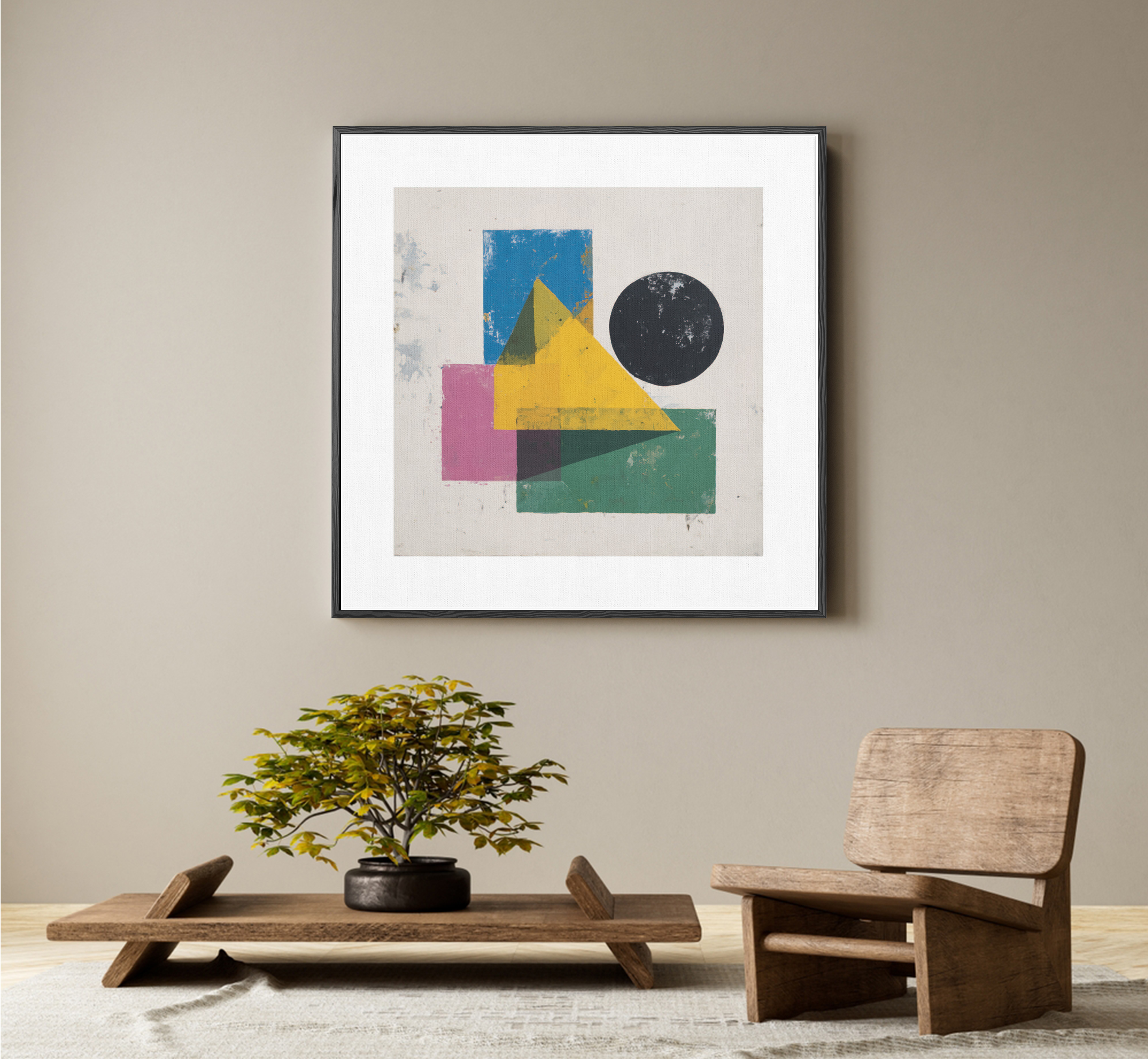 A vibrant interplay of circles, triangles, and rectangles layered in bold colors. This piece redefines order and chaos, where geometry becomes poetry on canvas.
