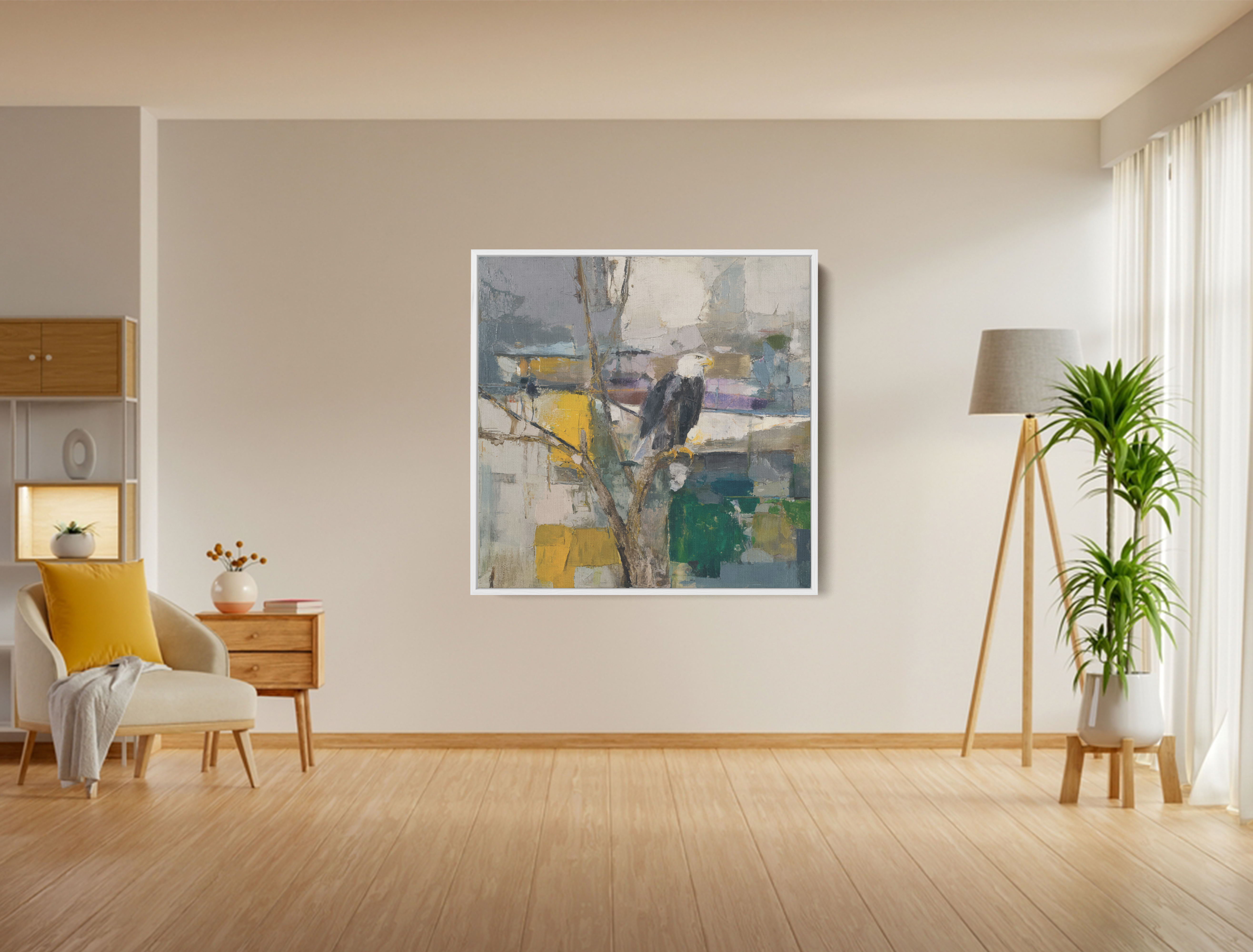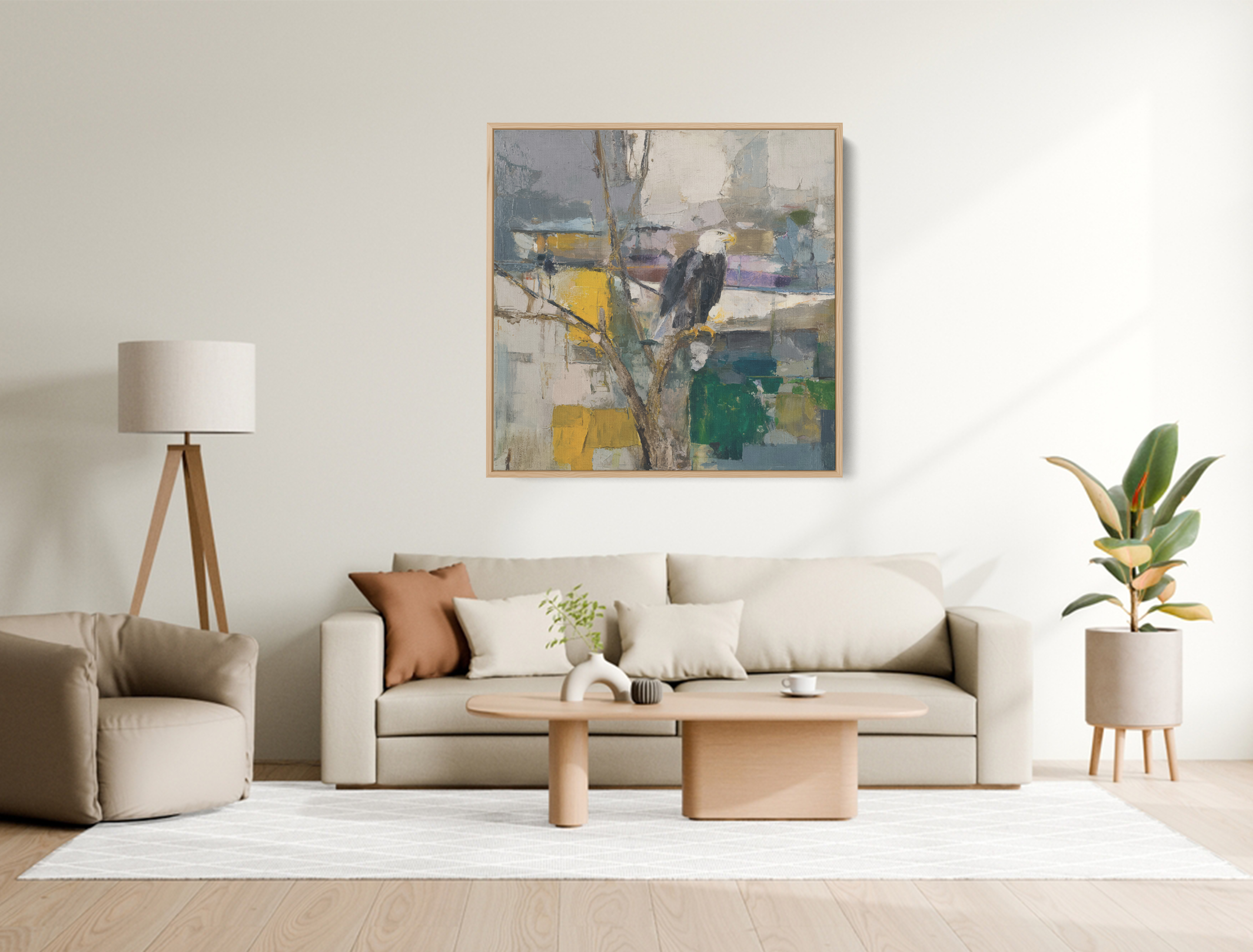 An eagle rests on bare branches, painted through abstract blocks of color that blend nature with geometry.