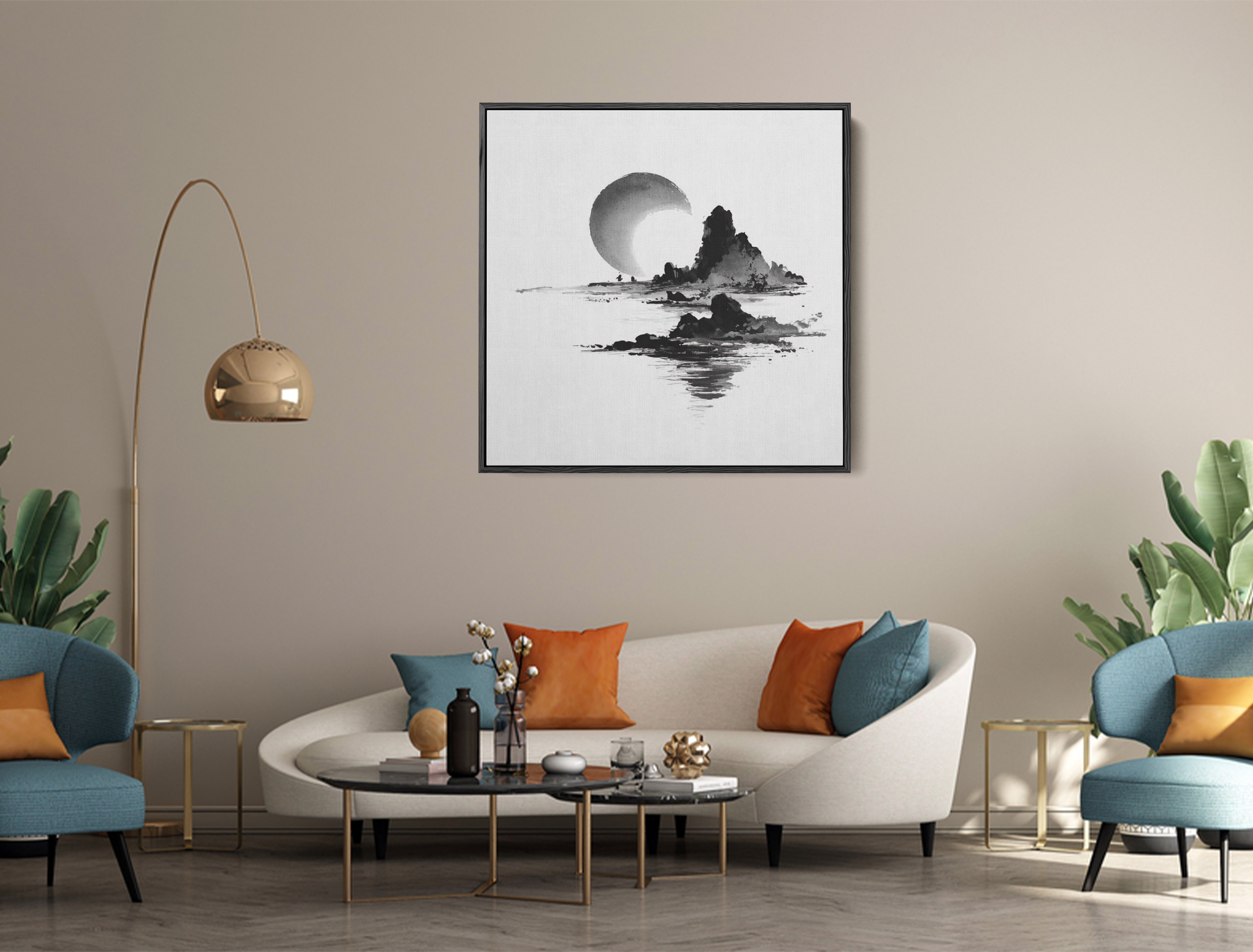 A meditative interplay of shadow and light — the crescent moon rises behind rugged peaks, its reflection dissolving into still waters. A vision of solitude, balance, and timeless beauty captured in monochrome tones.