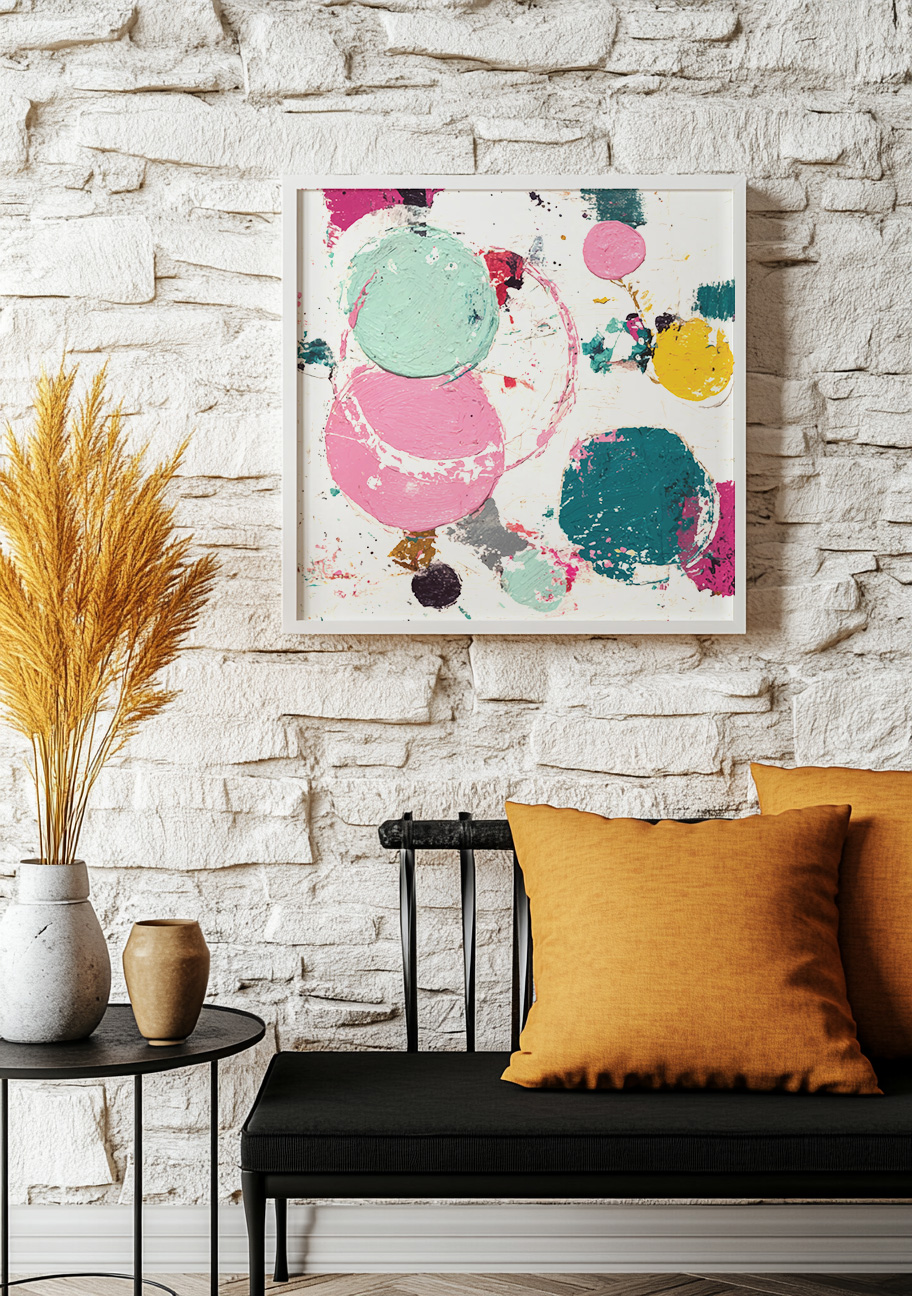 Soft pastel circles collide with bursts of bold hues, creating a whimsical balance of chaos and calm