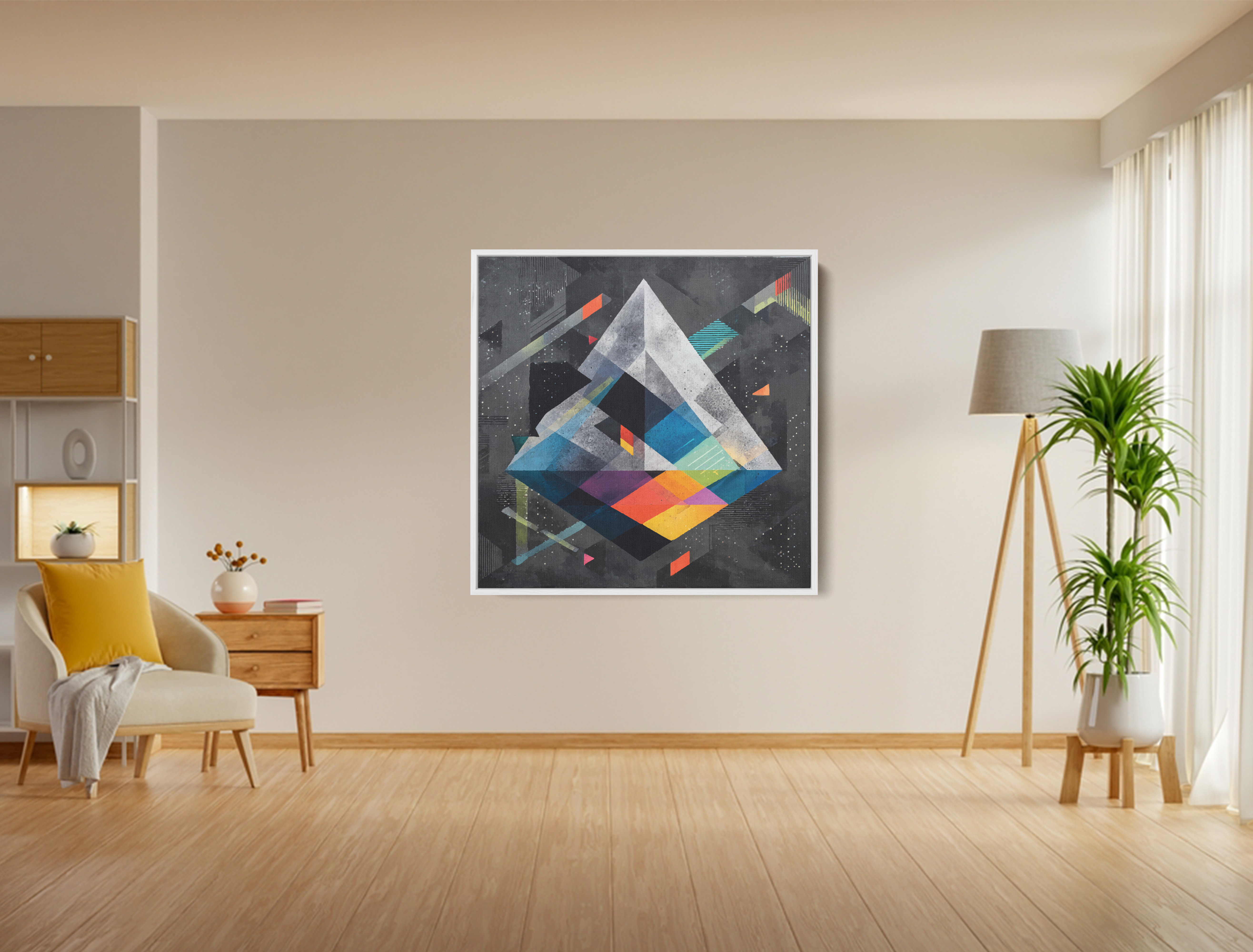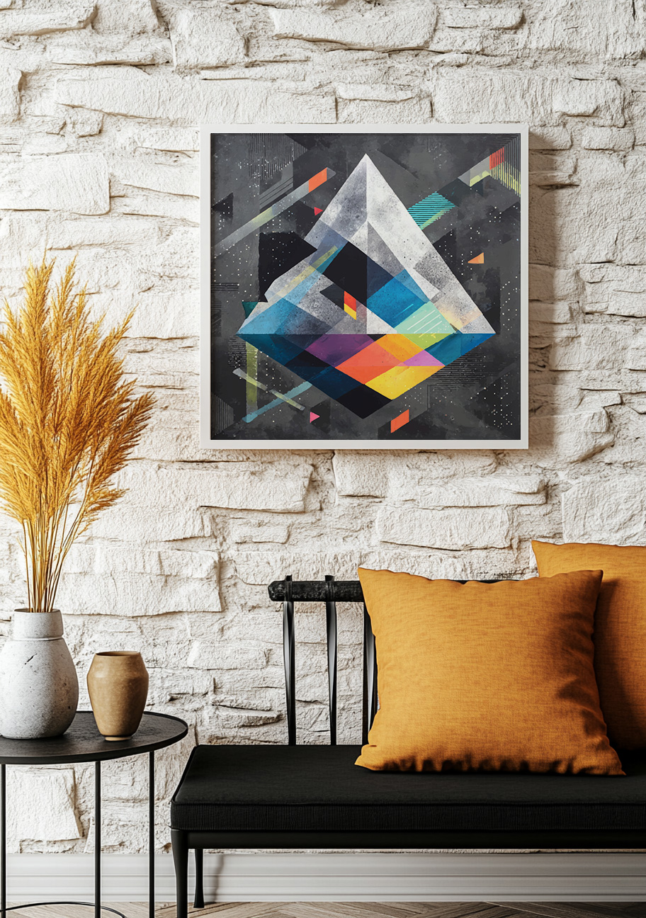 A kaleidoscopic vision where geometry meets light—this artwork captures the illusion of depth and cosmic wonder through layered prisms, vibrant reflections, and shifting planes that seem to float in infinite space.
