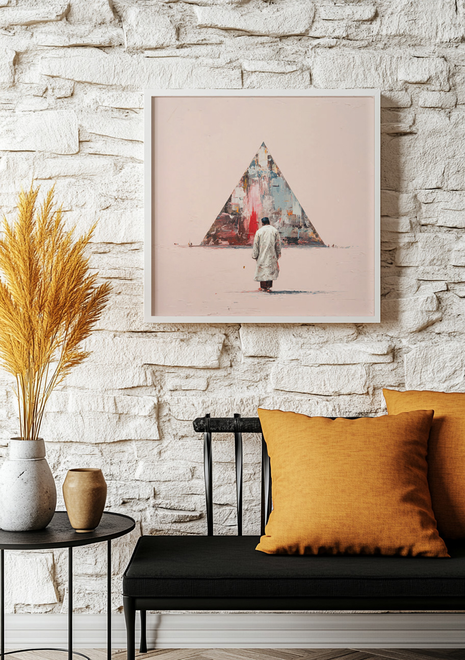 A lone figure stands before a towering pyramid of color — a symbol of mystery, transcendence, and inner awakening. The muted pink backdrop contrasts with the chaotic strokes within the geometric form, creating a dialogue between stillness and the unknown.