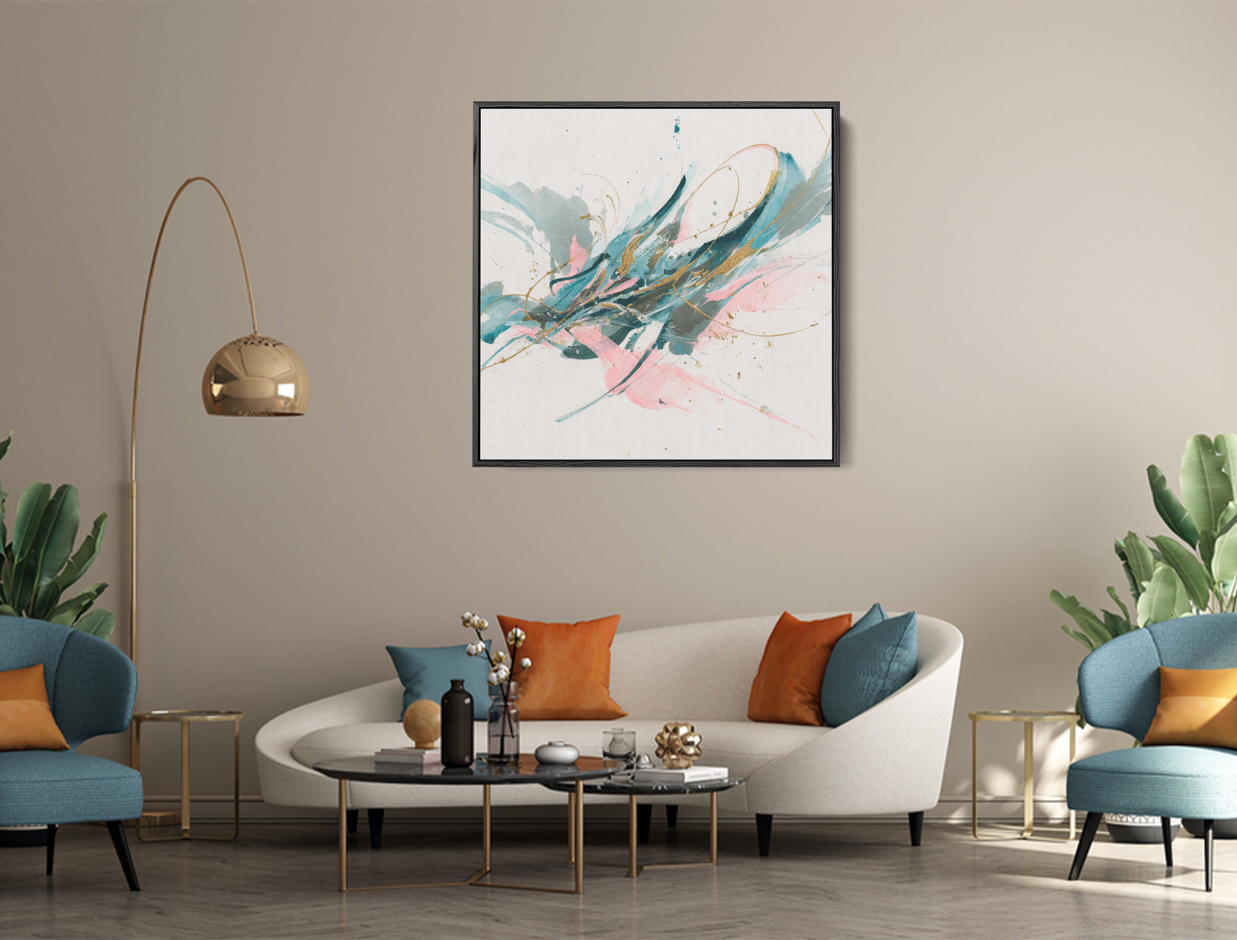 A graceful fusion of teal, blush, and golden strokes flowing in perfect harmony. This artwork brings balance, serenity, and timeless elegance to any modern space