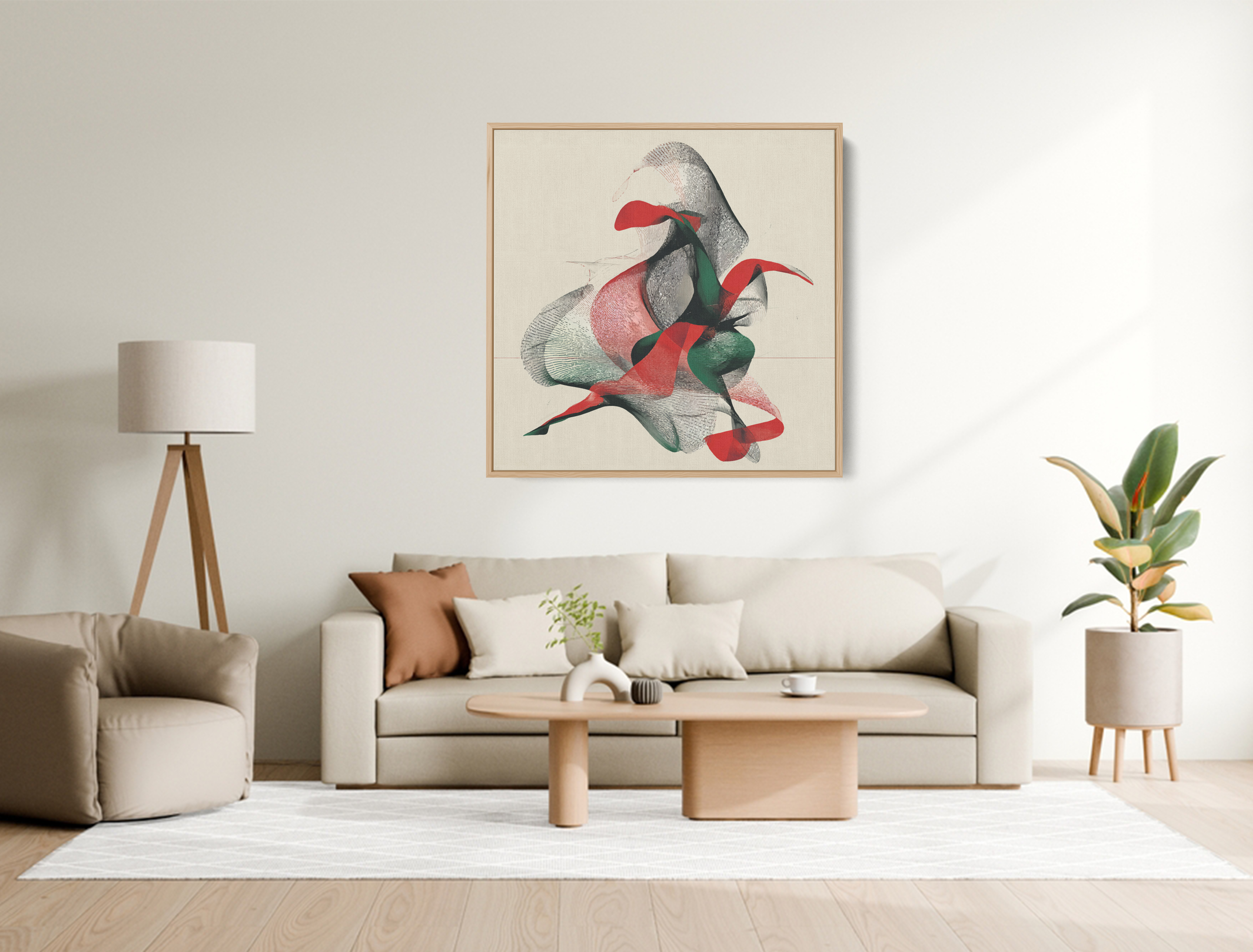 Flowing ribbons of red and green twist through soft textures of black and gray, forming an ethereal dance of energy and silence. This abstract composition blurs the line between movement and stillness, inviting the viewer into a world where form dissolves into pure rhythm.