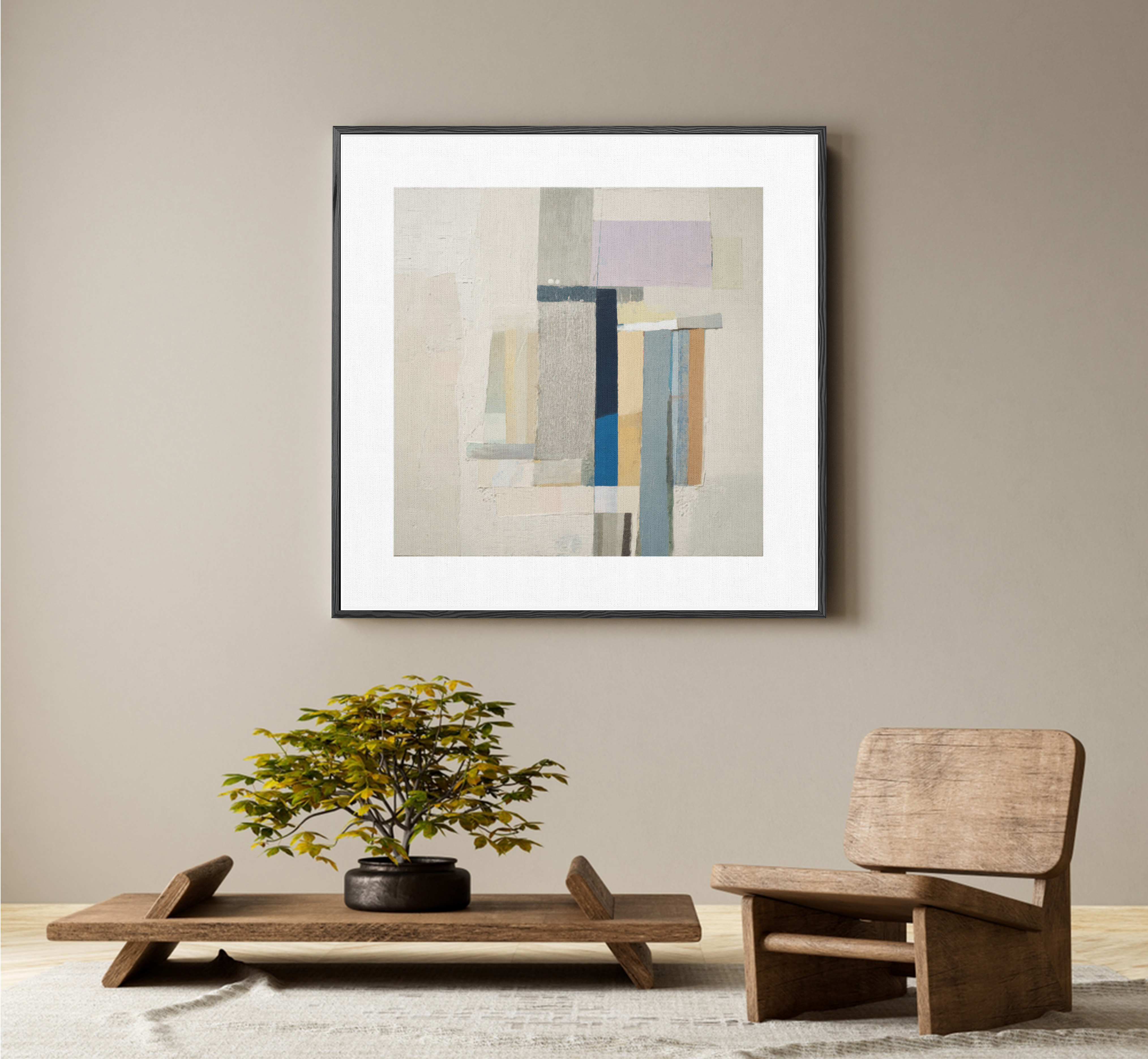 A serene interplay of muted tones and structured blocks, this piece reflects calm sophistication. Layers of texture and color converge in harmony, inviting the viewer into a quiet dialogue between balance and depth.